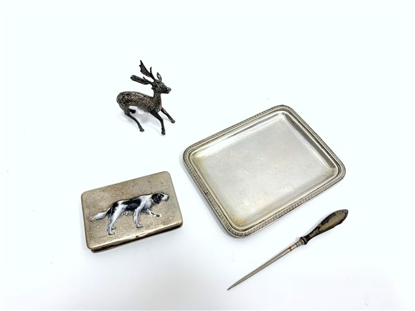 Lotto composto da un toy a forma di cervo, un piattino, un portapillole ed una piccola lima conica, in argento e metallo (gr 240 ca lordi) (difetti)