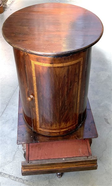 Comodino a colonna lastronato e filettato in legni vari con pianetto tondo e ba