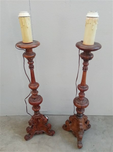 Coppia di candelieri tripodi in legno intagliato,secolo XVIII, montati a luce elettrica (h cm 85) (difetti)