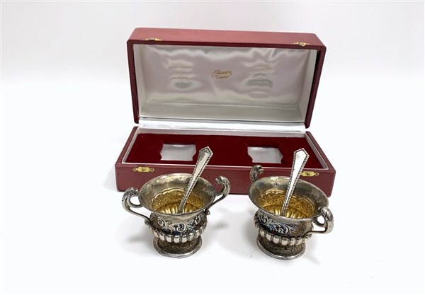 Coppia di saliere in argento con corpo sbalzato a fiori e anse leonine, Inghilterra secolo XIX. In custodia Massera Torino (gr 100) (lievi difetti)