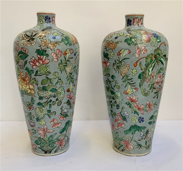 Coppia di vasi a balaustro in porcellana a fondo azzurro, decorati a motivi flo