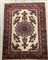 Decoro con medaglione policromo stellato con puntali e decorato con volute con motivi kashmir anche negli angoli. Fondo bianco. Bordura Herati con motivo a meandro. Cartiglio in lingua persiana decorata con i colri della bandiera iraniana (cm 207x145) (Lievi difetti e macchia)