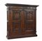Armadio in noce a due ante riquadrate da sagome intagliate ad unghiature e volute, montanti a mezza colonna scanalata, cappello aggettante, secolo XVII (cm 214x208x53) (difetti e restauri)
