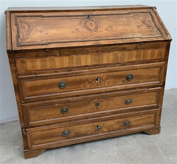 Ribalta con fronte a tre cassetti e mezzo, ribalta celante sei cassetti. Intarsiato e filettato in legni vari. Secolo XVIII (cm 128x115x60) (difetti e restauri)