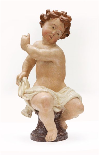 Arte del secolo XVIII "Putto" scultura in legno intagliato e laccato poggiante