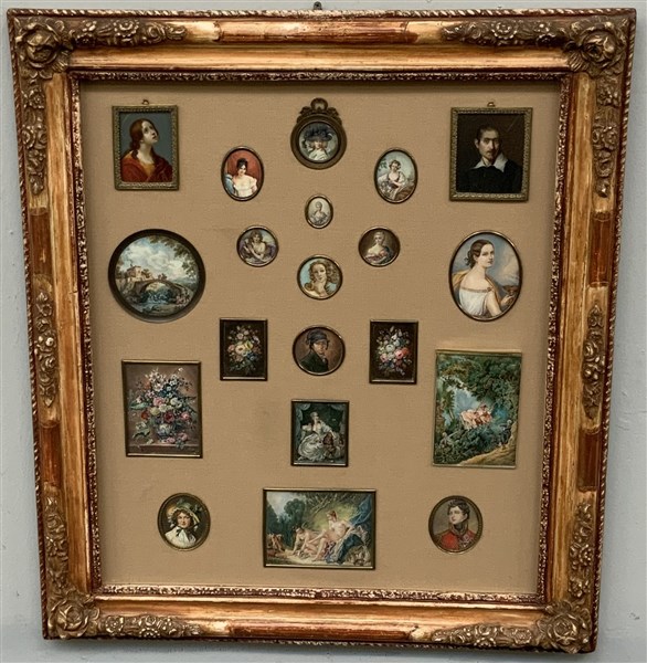 Composizione di venti miniature a soggetti diversi, alcune firmate. In un'unica cornice (cm 70x62) (difetti)