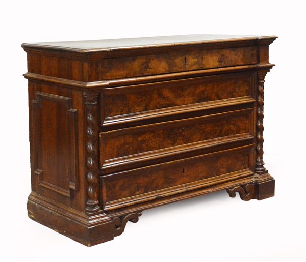 Antico cassettone in noce a quattro cassetti riquadrati e lastronati in radica, montanti a mezza colonna tornita, piedi sagomati (cm 143x103x64) (difetti e restauri)