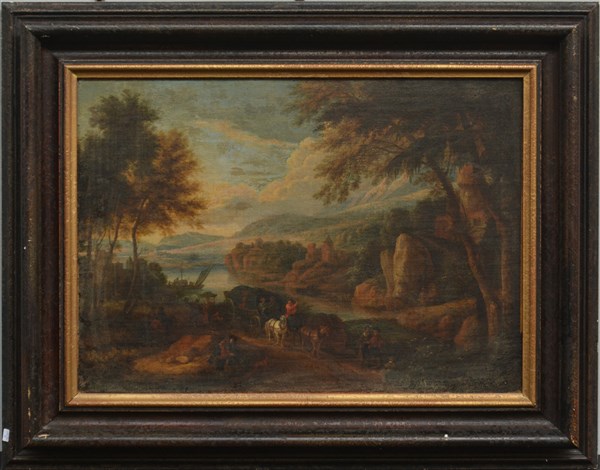 Ignoto "Paesaggio con figure e carrozza" antico dipinto ad olio su tela (cm 42x58). In cornice