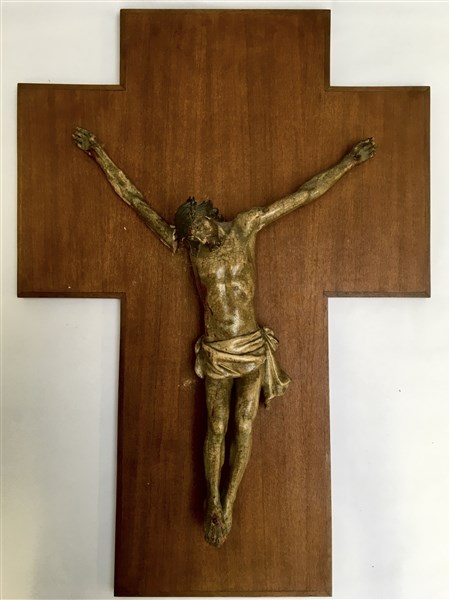 Artista del secolo XVIII "Cristo crocifisso" scultura in legno laccato (h. cm 46) Montato su croce di epoca posteriore (difetti e restauri)
