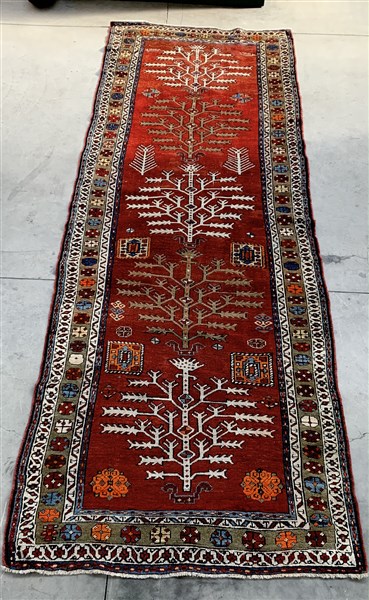 Tappeto Kazak, Caucaso, inizio Secolo XX, decoro con cinque alberi della vita nei toni del bianco e nocciola su fondo rosso. Alla base degli alberi è raffigurato l'antico simbolo del volatile mitologico a due teste, estremamente stilizzato. Datato con caratteri persiani in alto a destra e sinistra. Bordura con Gül policromi su fondo nocciola (Difetti, vecchi restauri, riprese di colore) (cm 338x119)