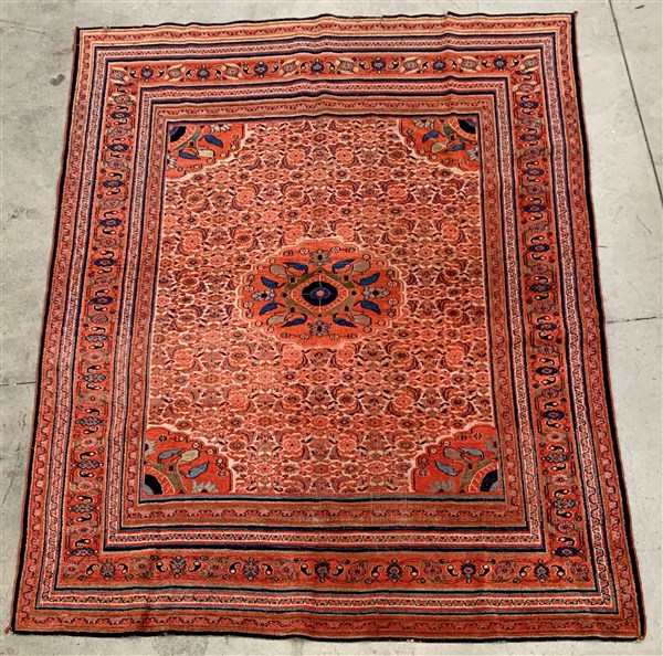 Decoro con medaglione a fondo corallo su campo bianco decorato a motivo Herati nei toni del corallo, azzurro, camoscio e bianco. Bordura a meandro con motivi Kashmir. (cm 196x152) (difetti, rapature e strappi alle testate)