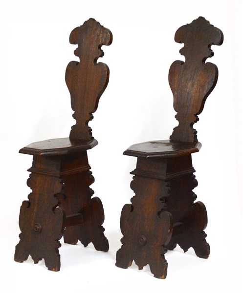 Coppia di sgabelli in noce con schienale alto e gambe sagomate, secolo XVI (dif