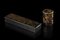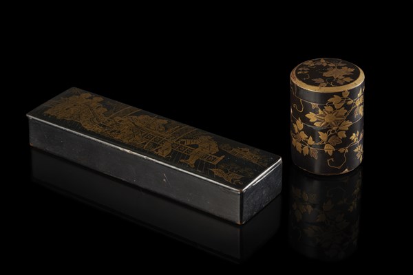 Due scatoline in legno laccato, una di forma cilindrica decorata a tralci fioriti e una rettangolare decorata con figure (difetti e mancanze)