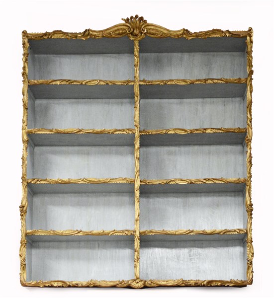Libreria pensile con ripiani a giorno in legno laccato con fregi in legno dorato ed intagliato a volute vegetali (cm 200x222x36) (difetti)