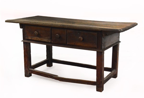 Antico tavolo in noce a tre cassetti nella fascia,gambe a pilastro riunite da traverse (cm 160x80x77) (difetti, restauri e mancanze)