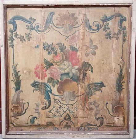 Sovraporta ad olio su tavola centrato da vaso fiorito entro cornice a volute e motivi fogliati. Secolo XIX (cm 101x98,5) (difetti e restauri)