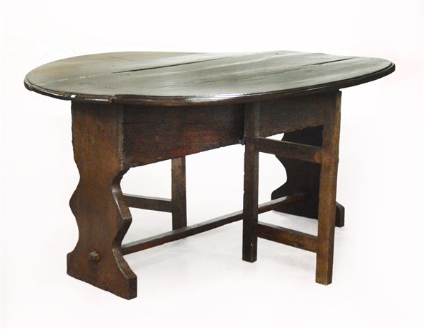 Antico tavolo a bandelle ad un cassetto nella fascia, gambe ad asso di coppe riunite da traverse (cm 156x80x50 chiuso)(cm 156x80x150 aperto) (difetti e restauri)