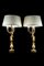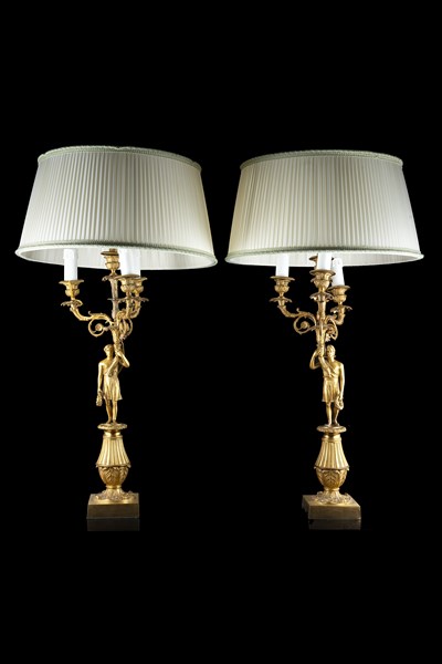 Coppia di candelieri a tre fiamme in bronzo con braccia sagomate e cesellate a motivi vegetali sorrette da figure a tutto tondo poggianti su base a plinto decorate a foglie d'acanto. Secolo XIX (h. cm 82) (restauri)