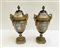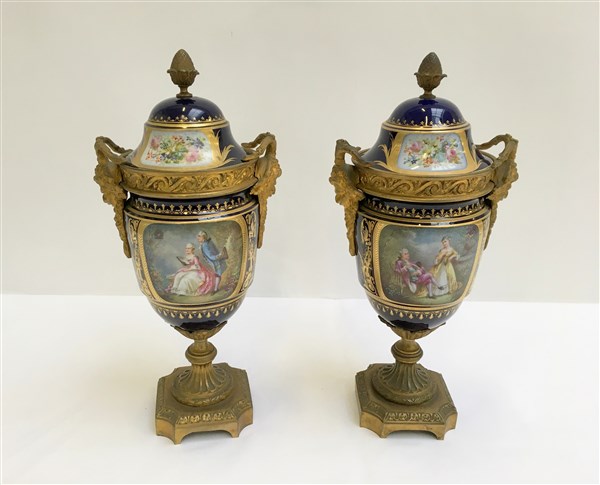 Manifattura francese, secolo XX. Coppia di vasi in porcellana a fondo blu decorata in policromia e a dorature con scene galanti, volatili e fiori entro riserve. Basi e ghiere in bronzo dorato, anse a mascheroni (h. cm 38) (difetti)