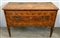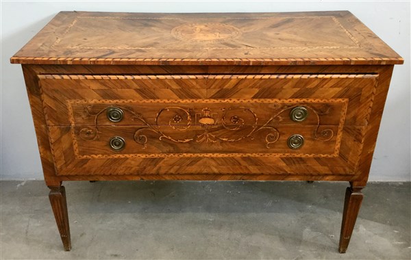 Comò lastronato e filettato, fronte a due cassetti intarsiati a vaso e volute fogliate. Piano centrato da tondo con figure e paesaggio. Gambe troncopiramidali (cm 125x88x57) (mancanze e restauri)