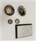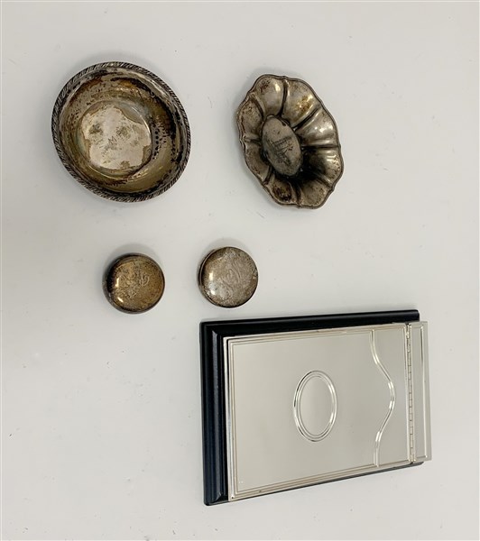 Lotto composto da due bomboniere cifrate e due piattini in argento titolo 800 uniti ad un porta block notes in metallo argentato (g 80)