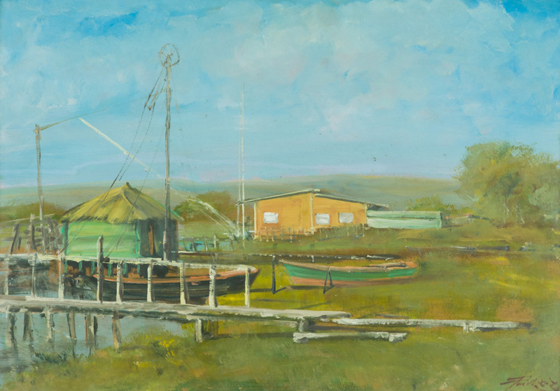Lorenzo Palazzi Marina di Pisa, Bocca d'Arno Olio su faesite, cm. 50x70 Firmato in basso a destra. Sul verso: firma e titolo.