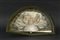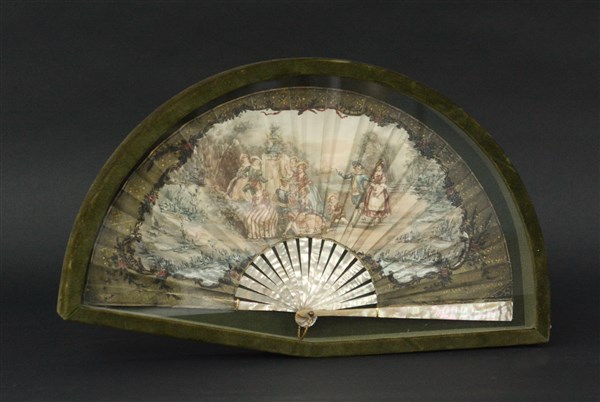 Ventaglio con pagina in stoffa decorato con scena all'aperto, stecche in madreperla. In teca (difetti)