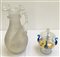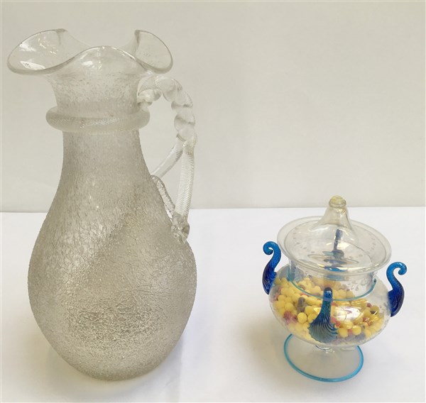 Compostiera a quattro anse ritorte in vetro cristallo con applicazioni in vetro celeste trasparente. Murano, anni '20/'30, unito a un versatoio in vetro incolore con ansa a torciglione. (h max cm 31) (gravi difetti)