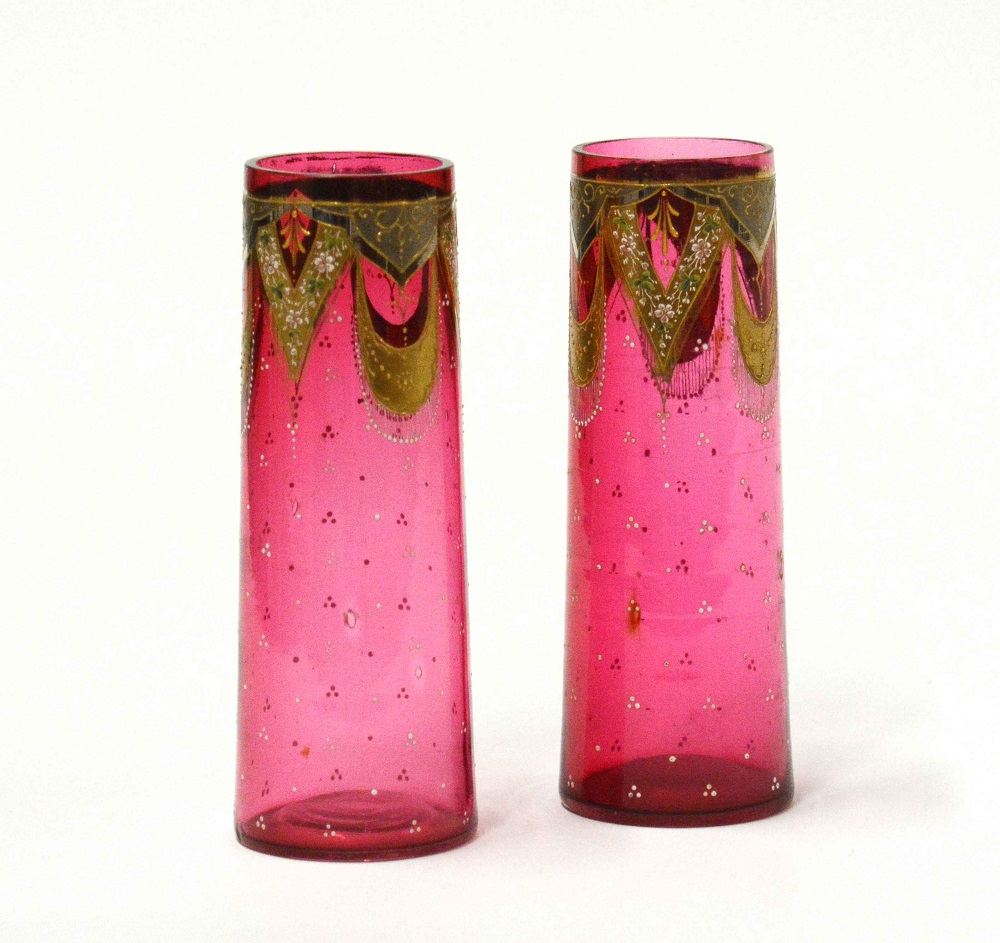 Coppia di vasetti in vetro soffiato trasparente ametista chiaro decorati a mano con rilievi e dorature. Secolo XX. (h cm 19) (lievi difetti)