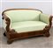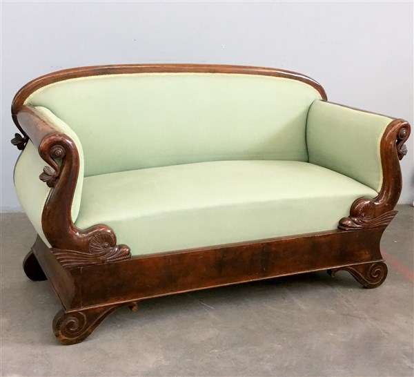 Divano a due posti di forma mossa, braccioli e piedi intagliati a delfini e volute. Secolo XIX
