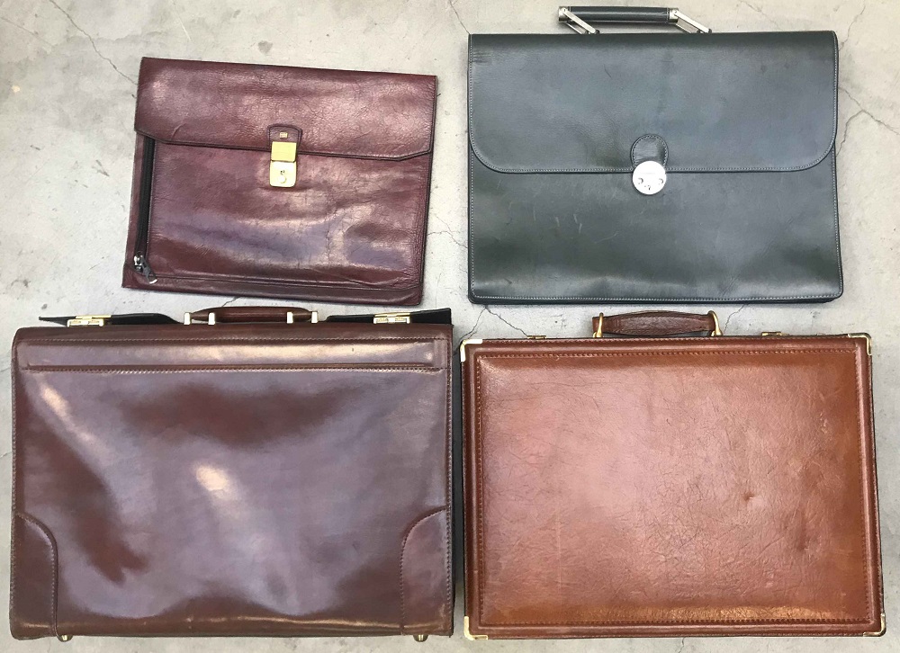 Lotto composto da tre borse da lavoro in cuoio di vari colori e dimensioni e un portadocumenti (difetti e segni d'uso)