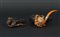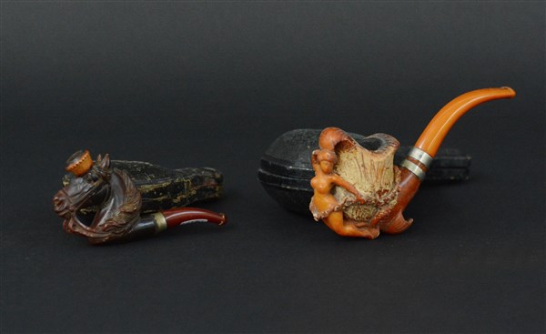 Lotto di due pipe con fornelli in bachelite raffiguranti testa di cavallo e sirene in custodie originali (difetti)