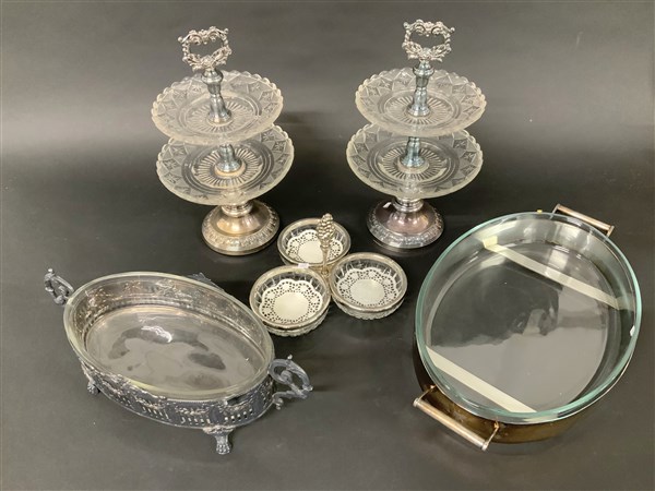 Lotto composto da due alzatine portafrutta, un portadolce, un centrotavola e un vassoio biansato in metallo argentato, cristallo e vetro (h max cm 39) (difetti)