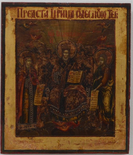 Icona ad olio su tavola raffigurante la Deesis - Cristo tra Madonna e San Giovanni Battista, bordura dorata e inscrizioni in cirillico (cm 26,7x23) Russia, secolo XIX (restauri)
