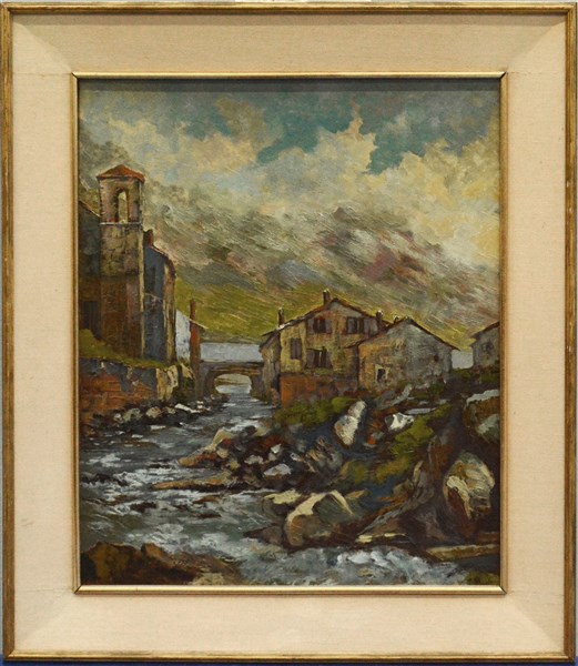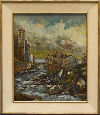 "Paesaggio a Vallespluga" 1968, olio su compensato (cm 60x50) Firmato in basso a sinistra. Al retro: cartiglio con titolo e data. In cornice