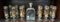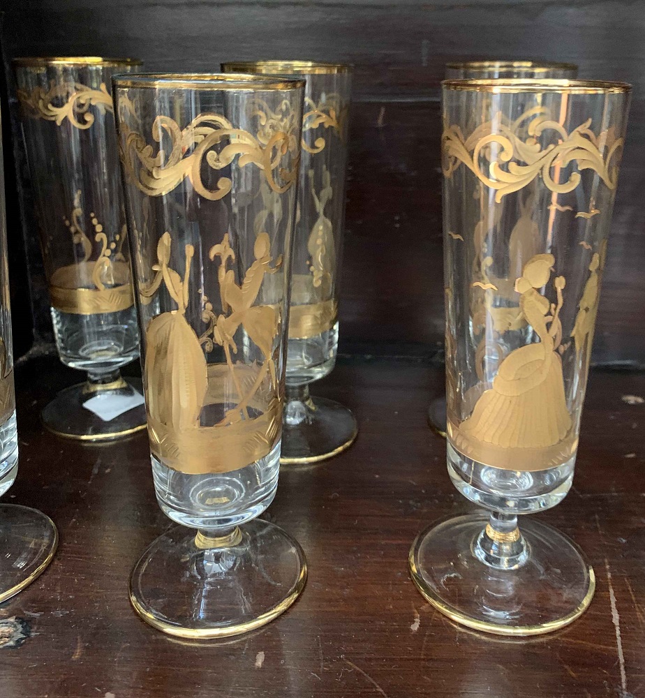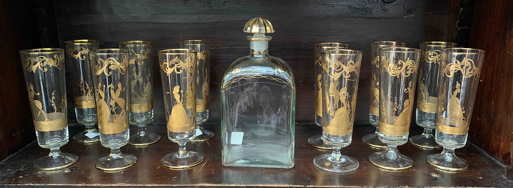 Lotto composto da dodici bicchieri in vetro trasparente decorato a dorature a scene galanti ed una bottiglia con tappo in vetro profilata in oro (difetti)