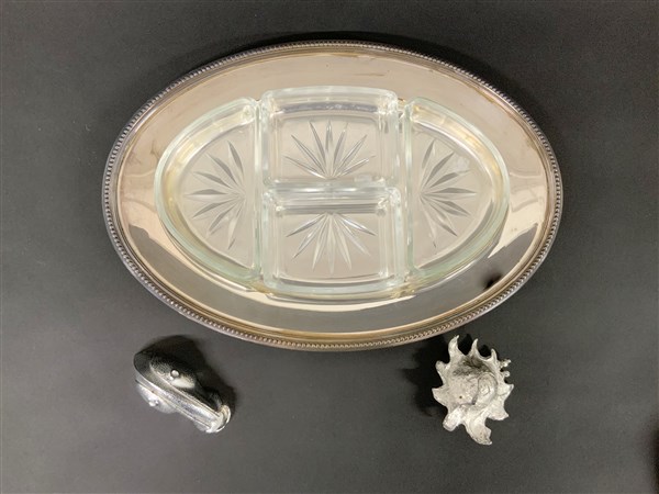 Christofle, lotto composto da un antipastiera e due fermacarte in metallo argentato e vetro (difetti)