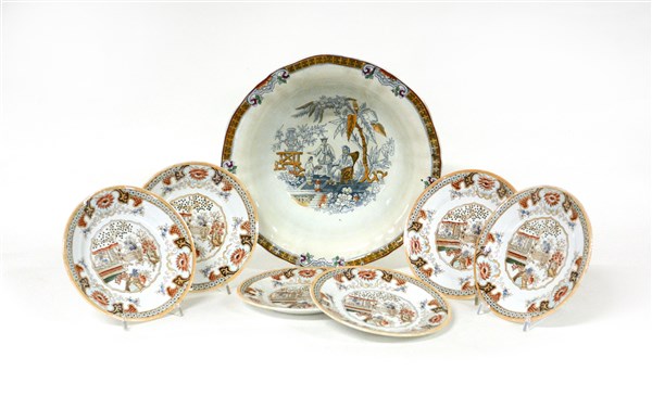 Lotto composto sei piatti in ceramica a decoro orientale della serie "Calcutta" uniti a un centrotavola in ceramica decorata a motivi orientali. Marcati sotto la base. (Piatti cm d 20,5; centrotavola cm h 10, cm d 35) (lievi difetti)