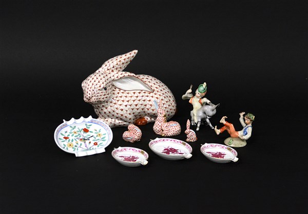 Manifttura Ungherese, Herend, lotto composto da due figure, quattro posaceneri e tre sculturine raffiguranti conigli in porcellana policroma con decori diversi, uniti ad una scultura raffigurante coniglio di diversa manifattura