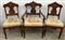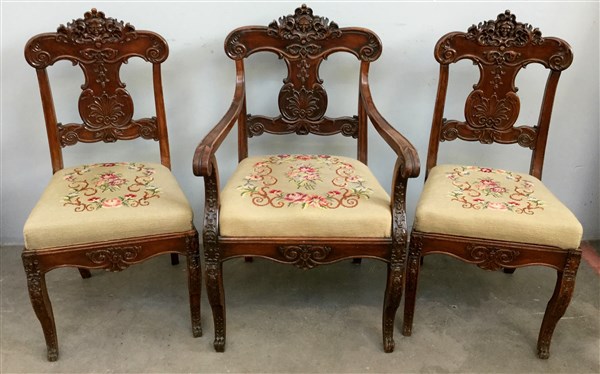 Gruppo di due sedie e una poltrona in legno intagliato a mascheroni, riccioli ed elementi vegetali (difetti)