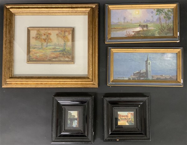 Lotto composto da cinque piccoli dipinti ad olio raffiguranti "Paesaggi" autoti e misure diverse. In cornici