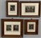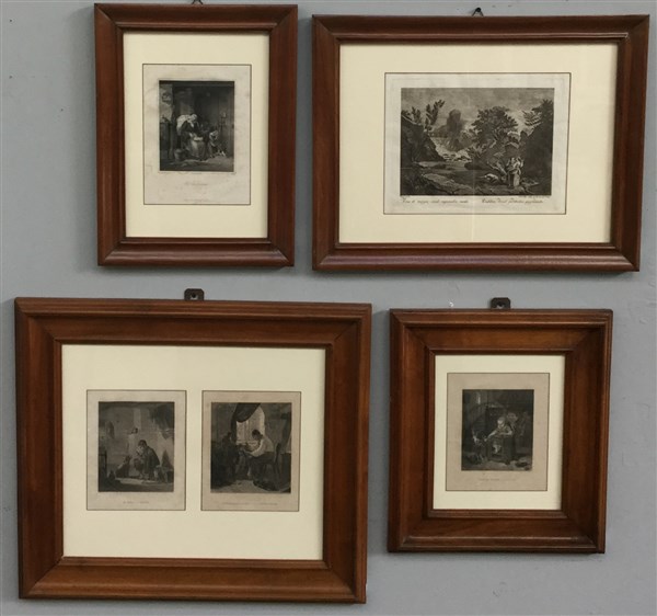 Lotto composto da cinque incisioni raffiguranti scene di interno e un paesaggio, in quattro cornici (difetti)