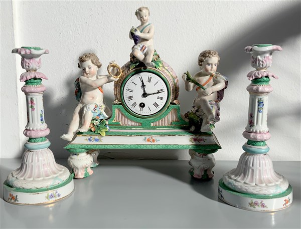 ANONIMO. Trittico porcellana formato da una pendola decorata da due figure di putti a tuttotondo e da due candelieri analoghi. Epoca della cassa XIX Secolo, movimento e quadrante posteriori. Movimento ad un solo treno con scappamento a bilanciere. Quadrante in smalto bianco a numeri romani. (difetti, sostituzioni)