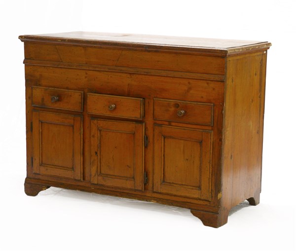 Madia in legno dolce con piano sollevabile, fronte a tre cassetti e tre sportelli (cm 134x96x60) (difetti)