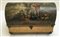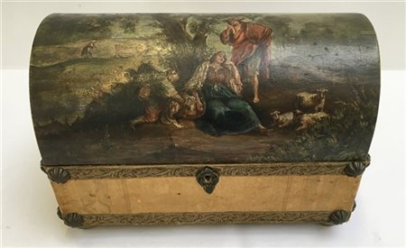 Scatola in legno rivestita in stoffa e decorata a borchie. Coperchio dipinto a scena contadina (cm 33x23x19) (difetti)