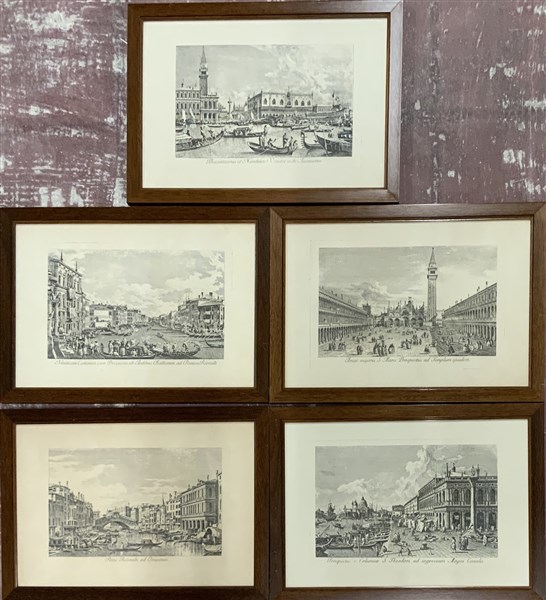Gruppo di cinque incisioni raffiguranti scorci di Venezia (cm 32x48 il folio) in cornici
