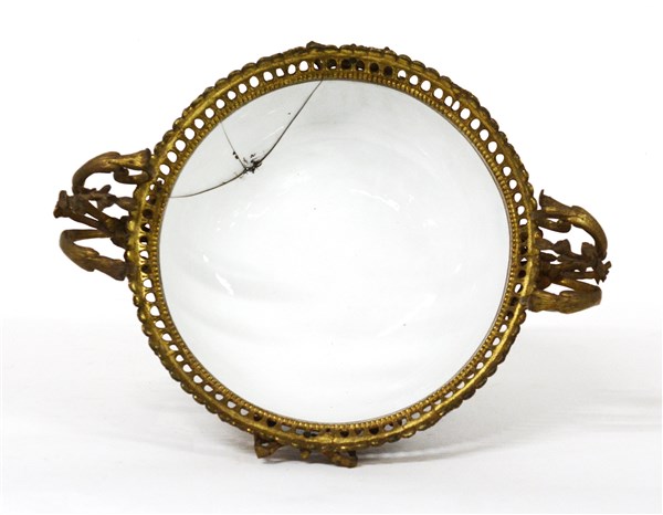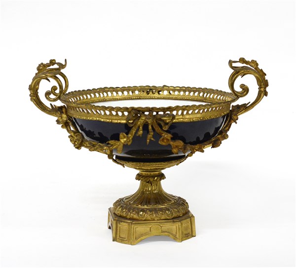 Coppa biansata in porcellana a fondo blu montata in bronzo dorato e cesellato a