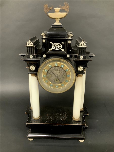 Pendola da appoggio a "portico"in legno ebanizzato, sorretta da quattro colonne di alabastro.