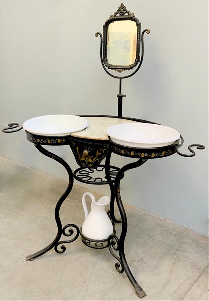 Toilette in ferro battuto con gambe mosse, cassetto sottopiano decorato con fregi dorati dipinti. Specchio basculante, accessori in ceramica non coevi e piano in marmo, secolo XIX (cm 107x145x65) (difetti)