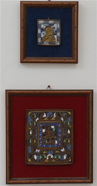 Lotto composto da due icone in bronzo e smalti raffiguranti San Giorgio e il drago e Madonna con Bambino (cm 14x12 e cm 7x5,5) Russia, secolo XIX. In cornici